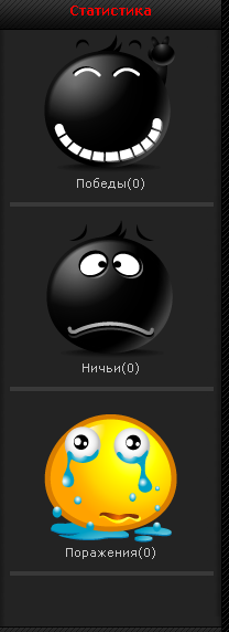 <center><img src="http://vik-games.net.ru/sobr/vict.png" class="IEpng" alt="Победы" align="center" border="0"><br>Победы(0)<br><hr size="2" width="100%"><img src="http://vik-games.net.ru/sobr/unhappy.png" alt="Ничьи" align="center" border="0"><br>Ничьи(0)<br><hr size="2" width="100%"><img src="http://vik-games.net.ru/sobr/too_sad.png" alt="Поражения" align="center" border="0"><br>Поражения(0)<br><hr size="2" width="100%"><br><br></center>